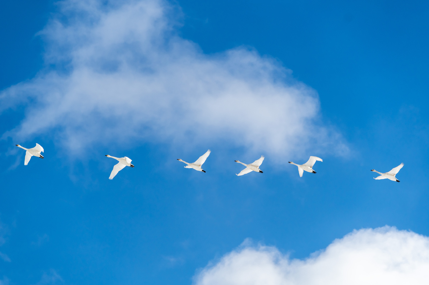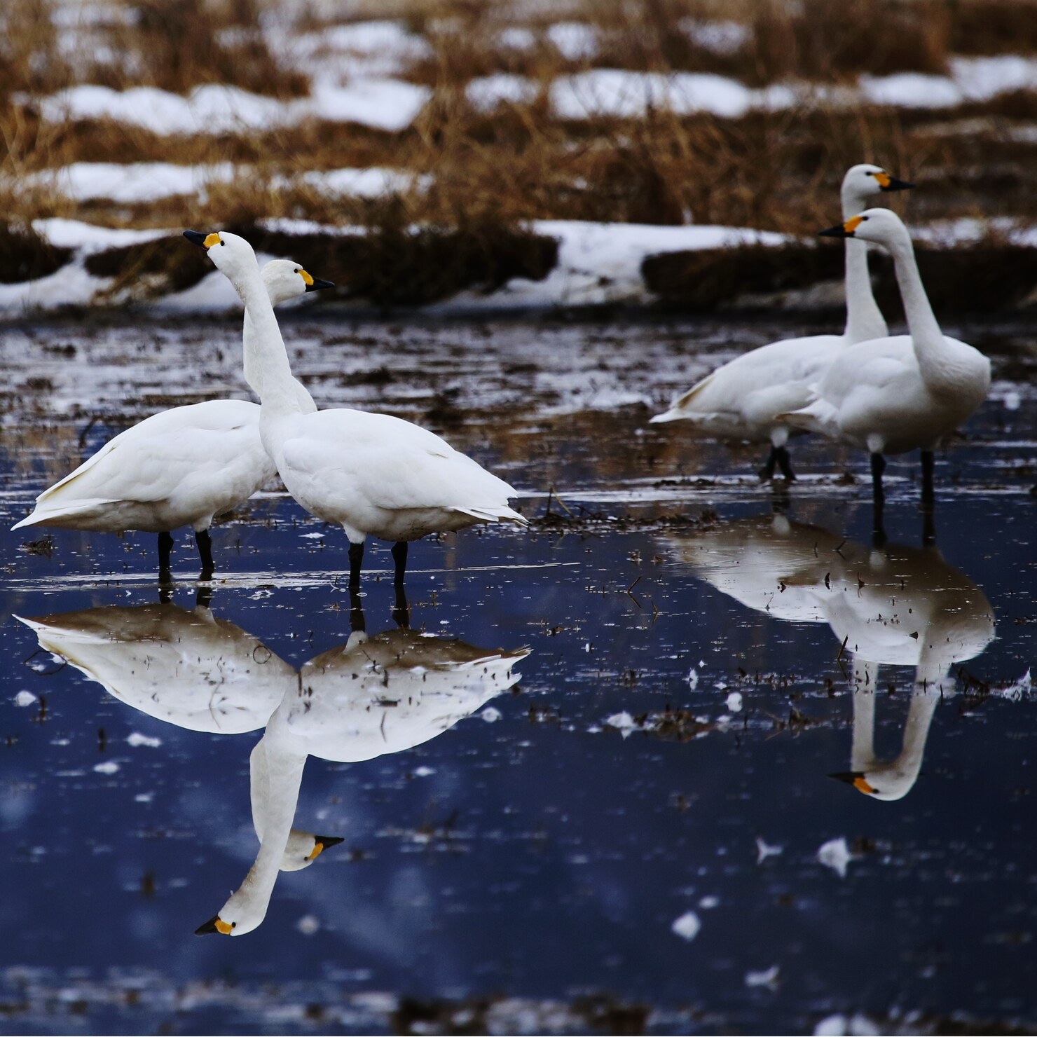 今年も1000羽以上の白鳥が飛来した邑知潟平野。白鳥が来るとカメラ片手に田んぼへ出勤するのが冬の楽しみです。今回は偶然にも2組のペアが仲良く寄り添う姿をとらえることができました。これからも一瞬を逃さずシャッターを切り続けていきます。