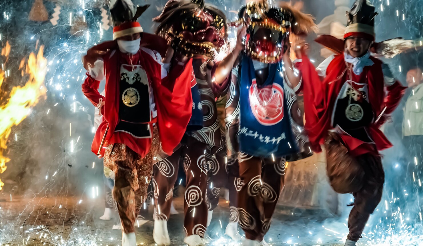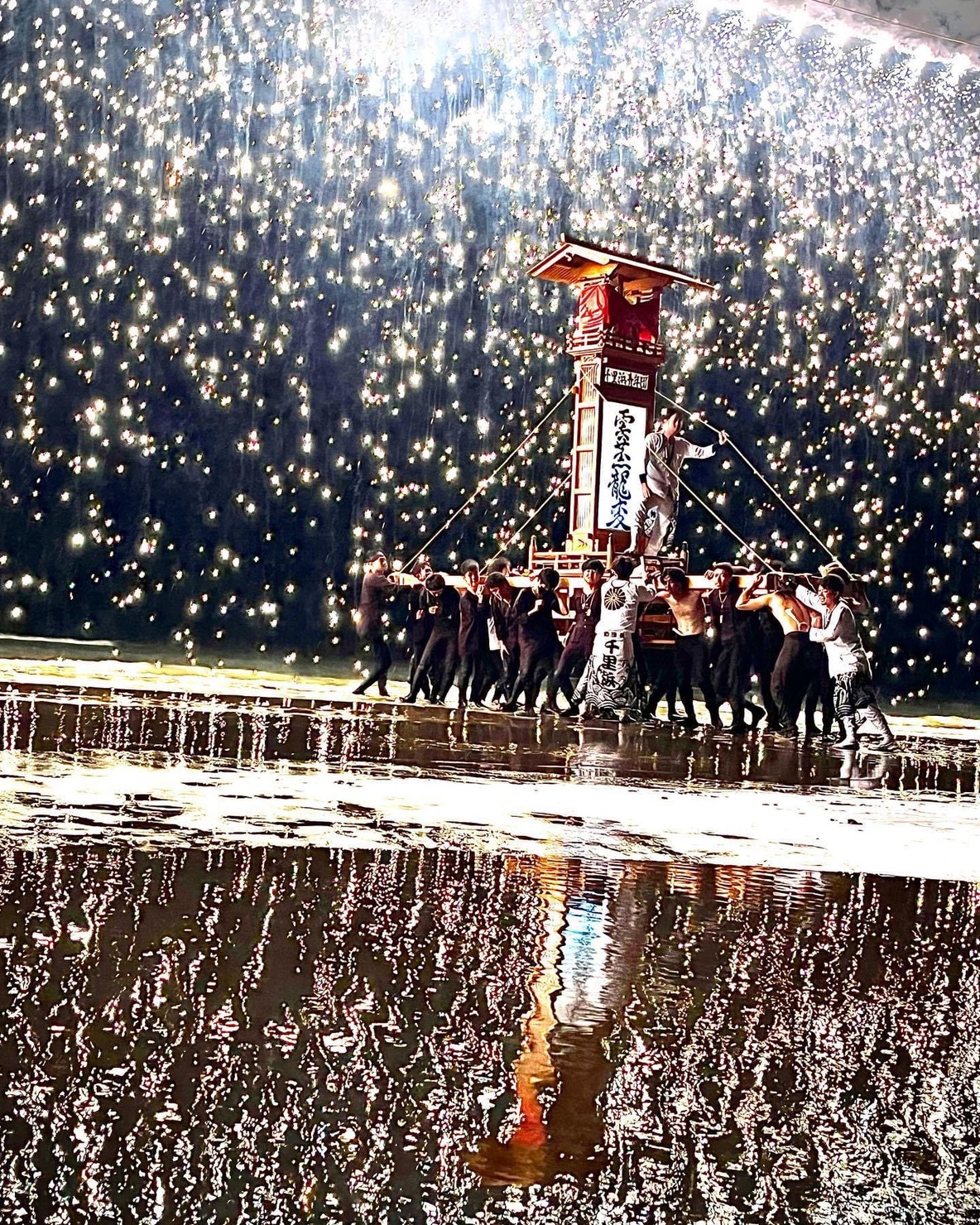 娘に誘われて初めて見た千里浜の祭り。奉燈を担いだまま海へと入っていく光景に興奮していたら、ナイアガラに照らされ勇壮な姿を見せた奉燈は、水面にも映り、幻想的で映えな一枚になりました。