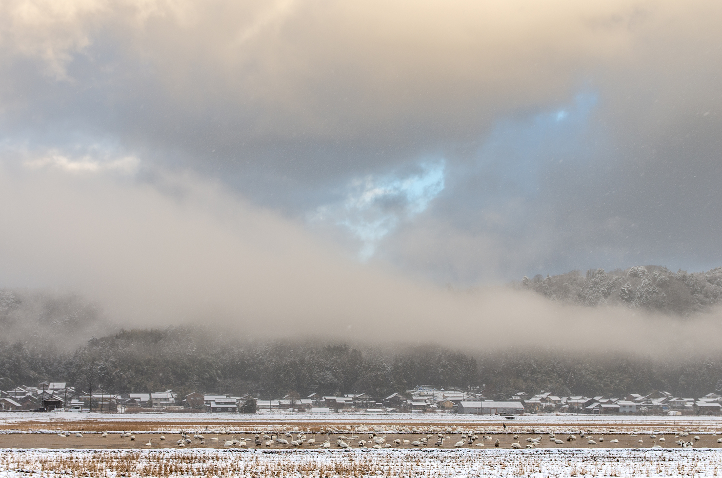 夜は安全な場所の池で休んでいたコハクチョウ達が次々に餌場にやってきました。低く立ち込める雲を背景に、エサを摂るコハクチョウのいる風景は、とても優雅にみえました。小さくですが鍋鶴も映っています。